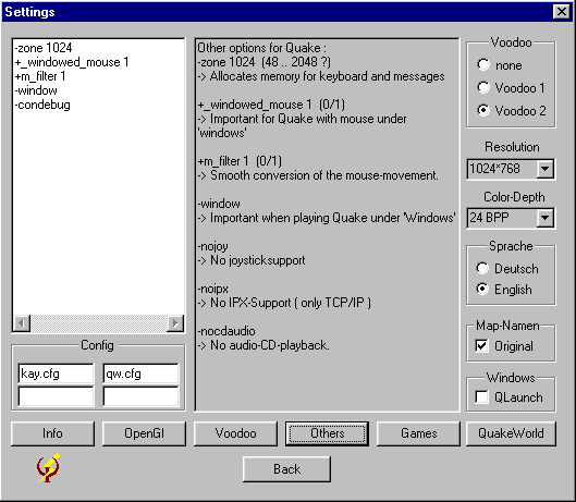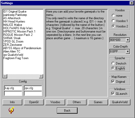 I placed only the important switches on the main-desktop of "Q-Start". With a click on the "Settings"-button you get to the other options where you can add your own settings and configs. Here You can add up to 4 personal config-files for your scripts and aliasses. Afterwards You can choose them from the mainmenu. The files must be placed in Your Quake-directory. Otherwise You must add the relative path to the files before the name ( e.g. "configs\mycfg.cfg" ).